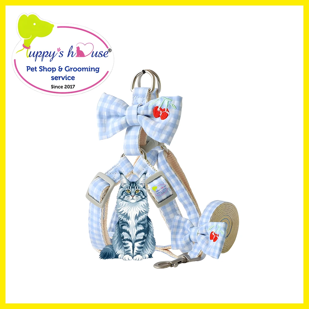 Set yếm dây dắt ca-rô đính nơ và charm hoa quả không chỉ có chất liệu vải mềm mại, tạo cảm giác dễ chịu cho thú cưng mà các khóa đai và dây dẫn cũng rất chắc chắn, giúp “sen” an tâm khi dắt “boss” yêu đi dạo.